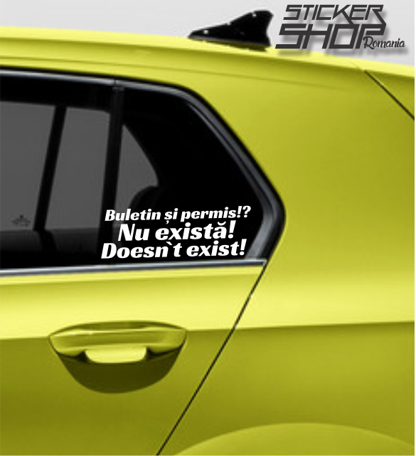 Sticker auto "Buletin și permis!? Nu există! / Doesn't exist!" - Un autocolant amuzant pentru mașina ta. Personalizează-ți vehiculul cu acest sticker auto original și rezistent. Ușor de aplicat. Descoperă gama noastră de stickere auto cu umor.