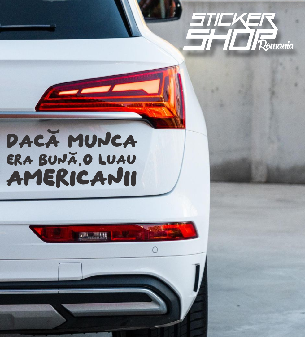 Ti-ai parcat vreodata masina si ai simtit ca-i lipseste ceva? Un strop de adevar balcanic, poate? Ei bine, prietene, stickerul asta e raspunsul! Arborand cu mandrie textul 'Daca munca era buna o luau americanii', vei transforma orice drum intr-o declaratie subtila (sau nu chiar atat de subtila) despre calitatea muncii autohtone. Pregateste-te pentru zambete aprobatoare, claxoane solidare si poate chiar oferte de angajare... glumesc (sau nu?). Aplica-l pe luneta, pe bara spate sau oriunde crezi ca mesajul asta genial va avea cel mai mare impact. Atentie: nu ne asumam responsabilitatea pentru eventualele discutii filozofice in trafic sau pentru cresterea brusca a sentimentului patriotic din jurul masinii tale. Dar hei, macar vei avea cel mai amuzant sticker din parcare! Ia-l acum de pe Stickershopromania.com si da culoare (si un pic de umor) drumurilor tale!